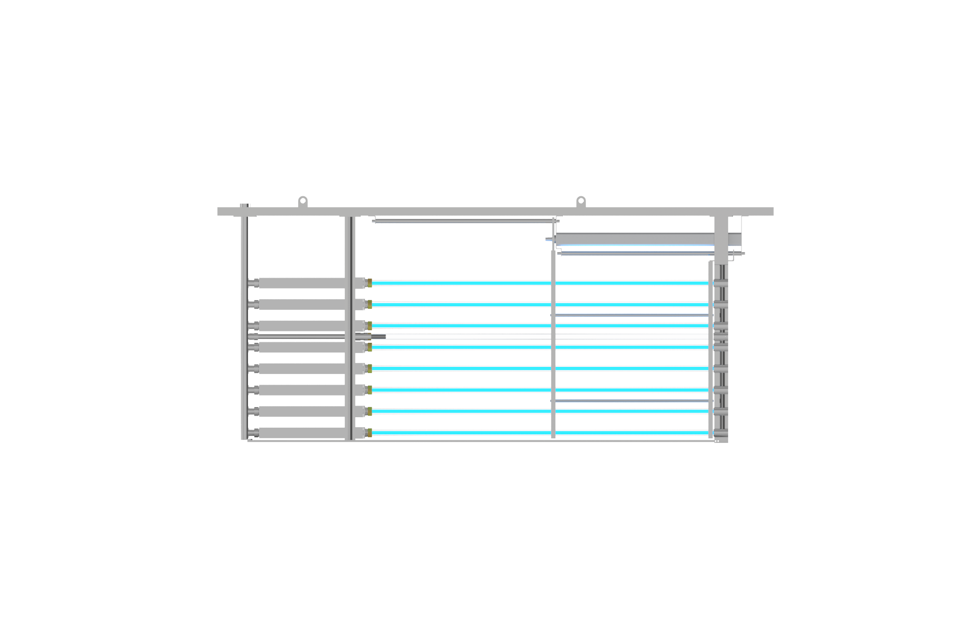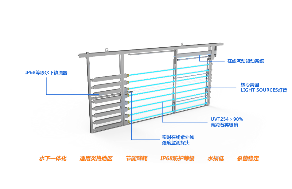 ![]() | 灯管水平安装: 紫外灯管与水流方向水平,每个模块包含8支320W灯管。最佳灯管与镇流器匹配,水冷式镇流器,灯管有效输出提高且稳定,光电转换效率提高5-8%。 |